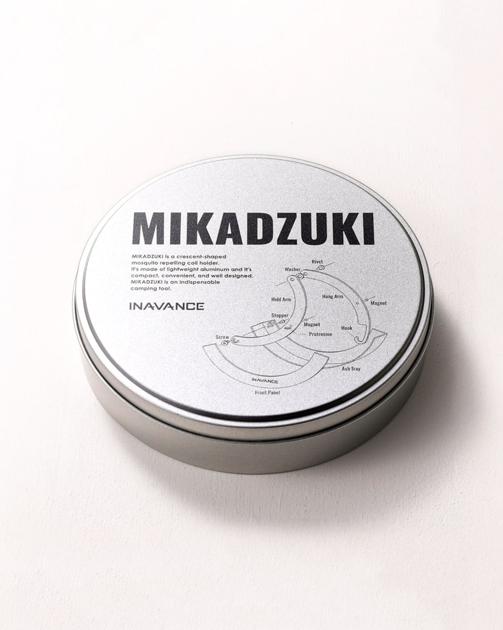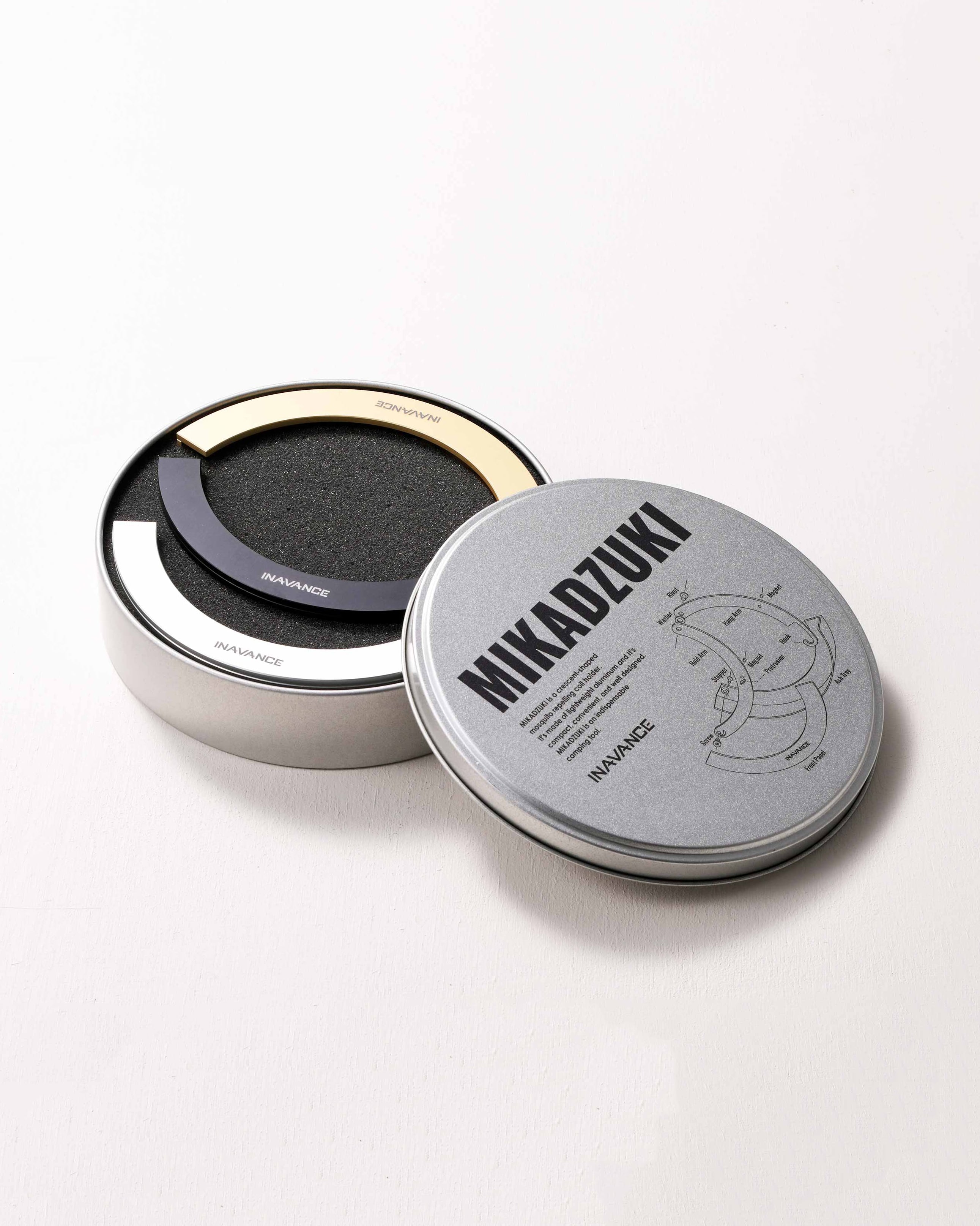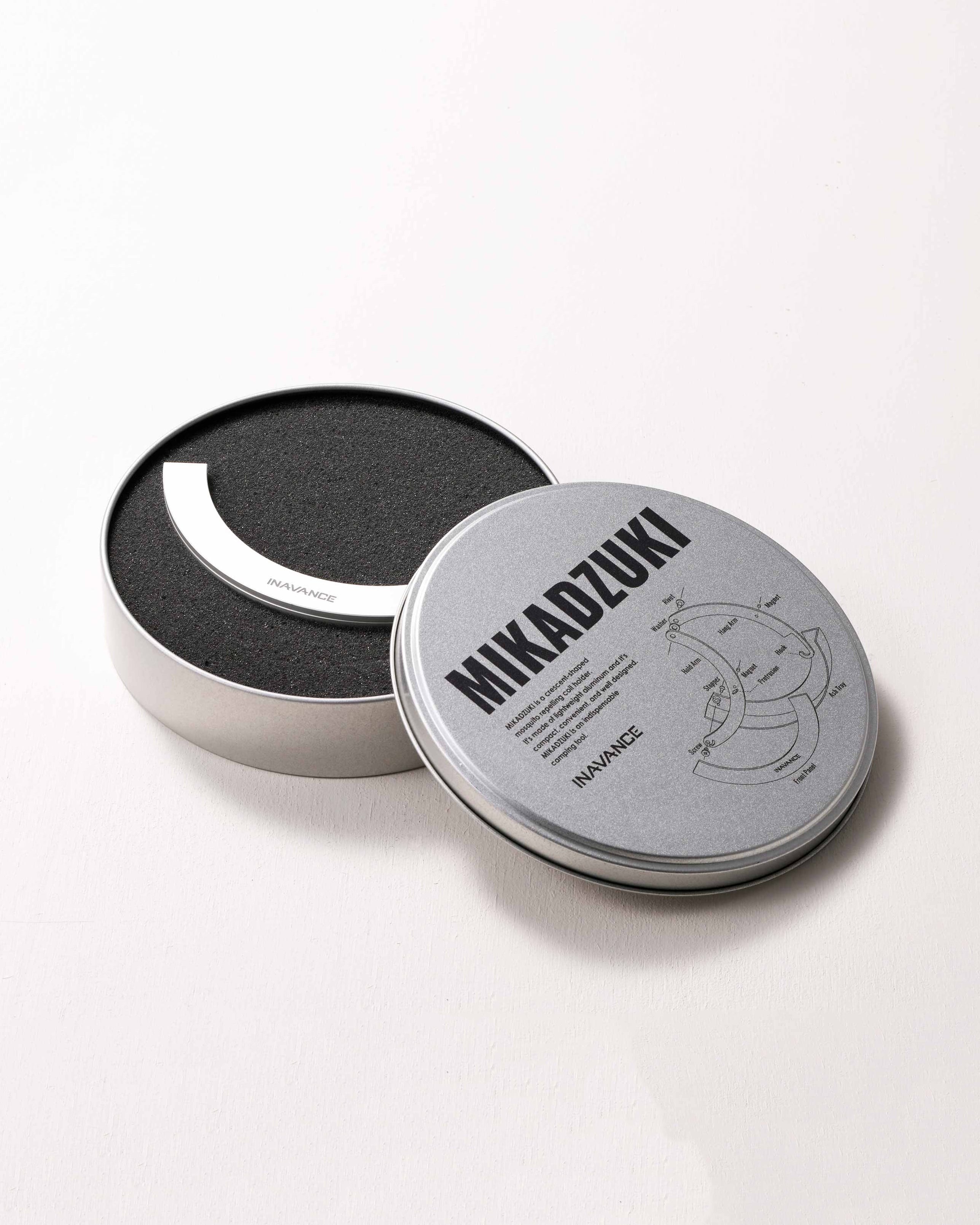 「MIKADZUKI CASE」は、MIKADZUKI専用の収納ケースです。MIKADZUKIを最大3個まで収納することが可能です。内側にはMIKADZUKIのサイズに合わせてカットしたウレタン素材のスポンジを施しています。ケースはインアバンスオリジナルのブリキケース。